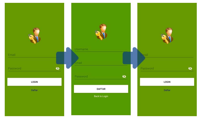 Email dan Password - anda membutuhkan kata sandi (password) dan email untuk masuk (login) ke aplikasi